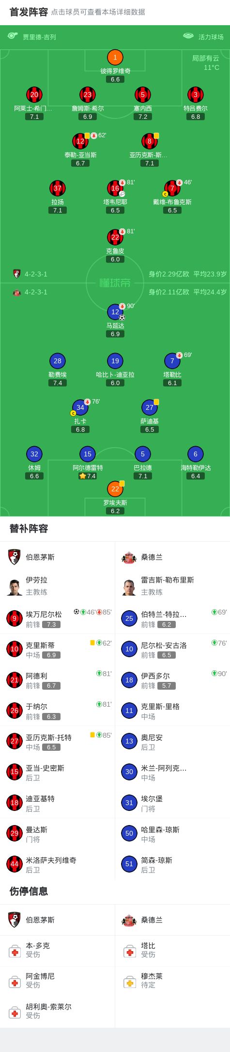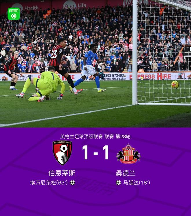 北京时间2月28日英格兰足球顶级联赛第28轮,伯恩茅斯主场对阵桑德兰。伯恩茅斯埃万尼尔松破门。桑德兰马延达破门。最终比分伯恩茅斯1-1桑德兰。