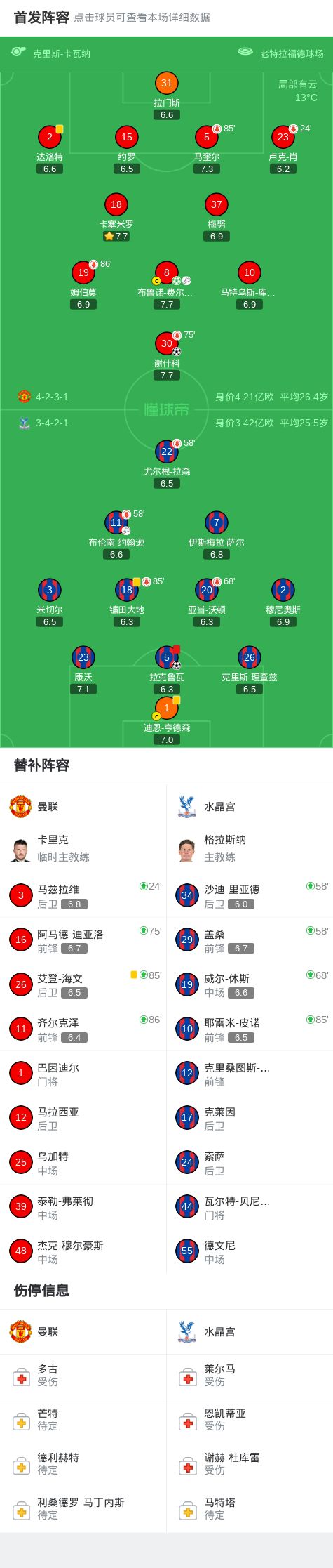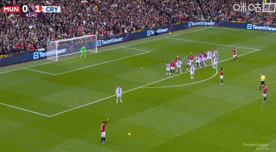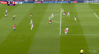 第65分钟,B费45度传中,谢什科头球破门,曼联2-1反超水晶宫